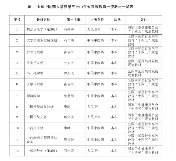 近日,山东省教材委员会办公室下发《关于公布第三批山东省普通高等教育一流教材名单的通知》,我校12种教材获第三批山东省普通高等教育一流教材,获批数量位居省属高校前列、全省医学院校首位。